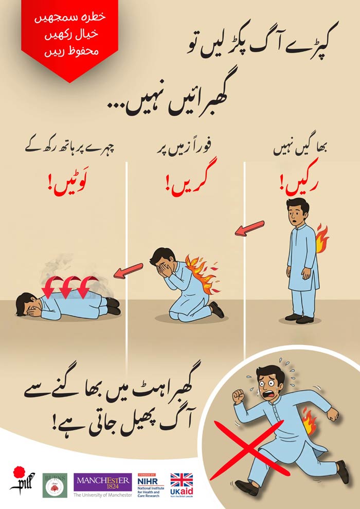کپڑے آگ پکڑ لیں تو متاثرہ شخص اکثر گھبراہٹ میں بھاگنا شروع کر دیتا ہے جو کہ سب سے بڑی غلطی ہوتی ہے کیونکہ اس طرح آگ مزید پھیل جاتی ہے، کبھی خدانخواستہ کپڑوں میں آگ لگ جائے تو ان تین لفظوں کو زہن میں رکھیں اور ان پر عمل کریں،