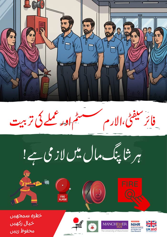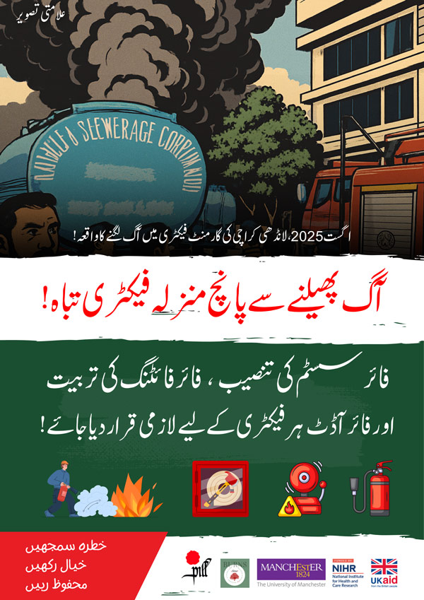 اور ایمرجنسی راستوں کا بند ہونا ہا سرے سے موجود ہی نہ ہونا۔ فیکٹری مالکان سے گزارش ہے کہ رہائشی عمارت میں فیکٹری یا کارخانہ لگانے سے گریز کریں، اپنی فیکٹریوں میں سیفٹی ایگزٹ کو موجودگی اور اس کی واضح نشاندھی یقینی بنائیں، فیکٹری میں فائر سیفٹی آلات اور ان کے استعمال کے حوالے سے حفاظتی مشقوں کا اہتمام کریں۔
